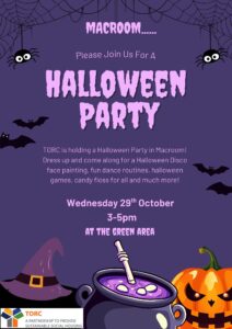 Macroom residents, Join TORC for a fun-filled Halloween afternoon with a disco, face painting, games, candy floss, and more!